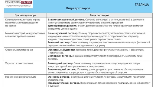 Виды договоров В делопроизводстве любого юридического лица образуется много договоров, которые необходимы для функционирования организации в целом. В Таблице представлена классификация договоров по определенным признакам и назначению...