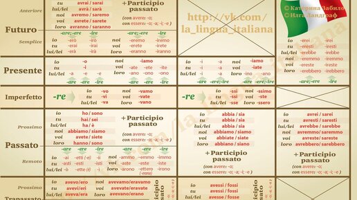 Для начала, хочу сказать, что Времена в языках надо изучать все и сразу, чтобы потом не было путаницы Для наглядности, предоставим в виде таблицы Итак, что мы тут замечаем, - Глаголы в итальянском языке имеют восемь времен . Изучать их нужно тщательно Четыре из которых, - относятся к простым и еще четыре сложных времени.. Базовая форма простого времени, - изменяется при помощи окончания. Сложное время, - обозначается вспомогательными глаголами, меняющими форму в соответствии со спряжением...
