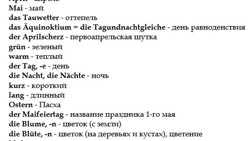 Der Frühling kommt, alles ist bald grün... В связи с этим давайте поговорим о весне, а именно займемся совершенствованием своих лексических и грамматических навыков, а также проверим свое умение чтения при помощи небольшого теста. Полезные слова и выражения Лексико-грамматическое упражнение Der Frühling (1) beginnt/endet mit März. Das Tauwetter beginnt, aber der (2) Schnee/Gras liegt doch. (3) Im/Am März wird es (4) wärmer/kälter und die Tage werden (5) kürzer/länger. (6) Im/Am einundzwanzigsten...