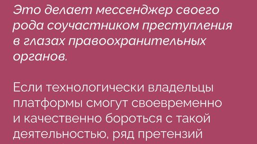 Будущее мессенджера Telegram в России остаётся предметом бурных обсуждений и противоречивых прогнозов. Появляются сообщения о возможной блокировке сервиса уже в апреле. Блокировка мессенджера. Ряд источников прогнозирует блокировку Telegram в апреле. Возможные причины: несоблюдение требований законодательства РФ (в т. ч. по хранению данных российских пользователей на территории страны); отказ предоставлять доступ к зашифрованным сообщениям по запросам уполномоченных органов; распространение контента, запрещённого на территории РФ...
