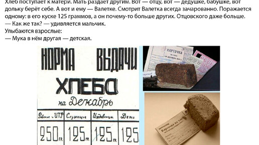 На одном из популярных интернет-порталов пользователь ChamPain рассказала, как сын с её помощью писал сочинение на тему блокады Ленинграда, как раз к 80-е летию её полного снятия. Мальчик получил четвёрку. Но далеко не за ошибки в словах. К делу подошли серьёзно, тем более история реальная в семье есть. Прапрабабушка мальчика была переводчиком в довоенные годы, жила как раз в Ленинграде. Автор поста рассказала, что наглядно показала сыну, что такое 125 граммов хлеба, то есть паёк на весь день. Мальчик, конечно, впечатлился...