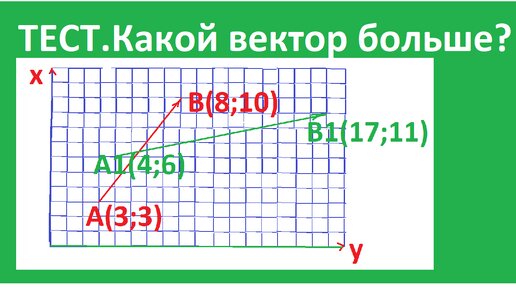 Приветствую читателей и подписчиков канала Тесты_математика! Интересные и не всегда простые задачи с векторами. Многие знают т помнят, что определить величину любого вектора по величине, или определить модуль (величину) вектора, можно и нужно по координатам. И где бы этот вектор не располагался на координатной сетке, его модуль определяется только по его координатам. Условие задачи. На координатной сетке изображены 2 вектора с указанными координатами. Вектор АВ: А(3;3); В(8;10); вектор А1В1: А1(4:6); В1(17;11)...
