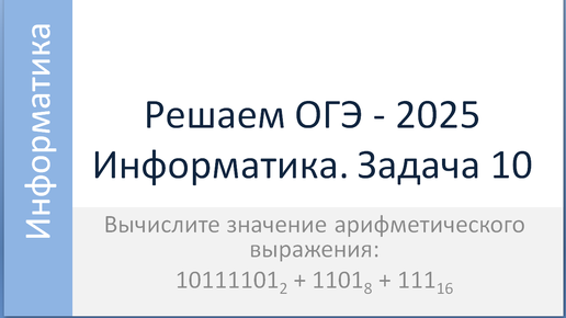 Приветствуем всех на канале "Информатика для всех"! Тема нашей статьи - разбор задач ОГЭ, системы счисления, задача 10. Условие задачи в демо-варианте 2025 года: Вычислите значение арифметического выражения: 10111101 (основание 2) + 1101 (основание 8) + 111 (основание 16) В ответе запишите десятичное число, основание системы счисления указывать не нужно. Требования к предметным результатам освоения основной образовательной программы: Записывать числа в различных системах счисления Примерное время выполнения задания (мин...