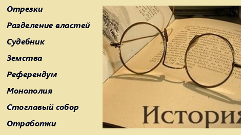 Запоминание исторических терминов: отрезки, разделение властей, Судебник, земства, референдум, монополия, стоглавый собор, отработки. Теорию исторических терминов можно получить на сайте Есть еще много интересных тестов на канале Знать мир на пять...
