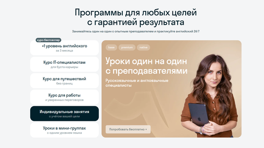 Преимущества: персональный преподаватель, гибкий график, можно выбрать носителя языка, есть специализированные курсы для профессиональных сфер...