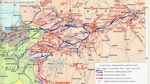 Итак, в атласах и учебниках по истории карта Отечественной войны дается в трёх видах. Во-первых, это карта наступления Наполеона на Москву.