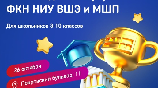 🏆 Совместная олимпиада ФКН НИУ ВШЭ и Московской школы программистов Московская школа программистов и Факультет компьютерных наук НИУ ВШЭ приглашают всех желающих школьников 8-10 классов на четвёртую открытую олимпиаду по информатике! До конца регистрации осталась одна неделя! Когда и где? 🗓 26 октября, 09:30 📌 Покровский бульвар, 11 (корпус R, D) ⭐️ На олимпиаде участников ждут задания по самым разным направлениям: — программированию, — компьютерной безопасности, — математическим основам информатики, — форматам хранения данных, — поиску информации в интернете...