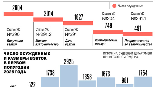 Самыми распространенными в России остаются взятки до 50 тыс. рублей Чаще всего закон карает коррупционеров за получение мелких взяток, а оправдывает — за дачу или обещание крупных сумм. Это следует из свежих данных судебной статистики по делам коррупционной направленности, которые опубликовал судебный департамент при Верховном суде. Наиболее распространенными в России по-прежнему остаются взятки в размере от 10 тыс. до 50 тыс. руб., а второе место удерживают «услуги неимущественного характера». Самым...