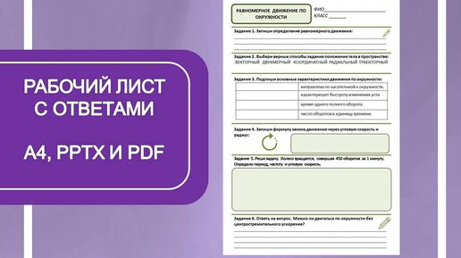 Рабочий лист «Равномерное движение по окружности» — это готовый инструмент для организации урока, который сочетает теорию и практику, экономит время учителя и помогает ученикам сразу применять знания. Вот как его можно использовать Раздайте лист после объяснения темы. Ученики не просто слушают, а сразу работают с формулами и понятиями: Задания с реальными понятиями (движение колеса, карусели, спутника) делают абстрактные формулы понятными. Обсудите ответы в классе — это вызовет интерес и дискуссию...