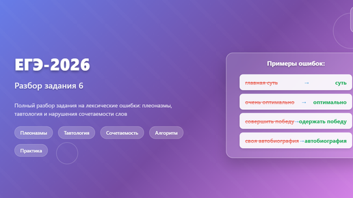Задание 6 — тот самый быстрый балл ЕГЭ-2026, который легко потерять из-за одного лишнего слова или неудачного сочетания. За 5 минут разберём: - обе формулировки — «исключить» и «заменить», - частые ловушки (плеоназмы, тавтологии, сбои сочетаемости), - рабочий алгоритм, чтобы вы уверенно отличали норму от ошибки. Ранее вышли разборы: В этот раз подробно разберём задание 6 — проверку умения видеть и корректировать лексические ошибки. Сделаем это спокойно и по делу, чтобы на экзамене не терять ни минуту...