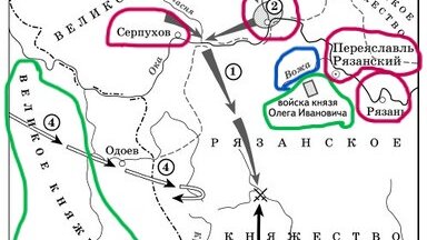 Для начала отметим географические объекты, которые являются ключами-подсказками: Отсюда следует, что эта карта по Куликовской битве, которая была против Золотой Орды, ханом которой был темник МАМАЙ. На его стороне участвовал Литовский Король ЯГАЙЛО, который кинул своего союзника и развернулся обратно в свои земли. Рязанский князь ОЛЕГ ИВАНОВИЧ тоже был на стороне МАМАЯ, однако важных боевых действий не предпринимал. Дальше попробуем назвать спрятанные объекты: (1) - войско Дмитрия Ивановича Донского;...