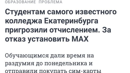 Департамент информационной политики в свою очередь заверил, что отсутствие у студента аккаунта в отечественном приложении не является основанием для отчисления. В одном из самых известных колледжей Екатеринбурга произошёл скандал из-за мессенджера MAX. Заведующая одного из отделений колледжа имени Ползунова собрала студентов и потребовала установить приложение «для получения официальной информации об образовательном процессе». При этом она заставила учащихся написать заявление на имя директора об отчислении по собственному желанию...