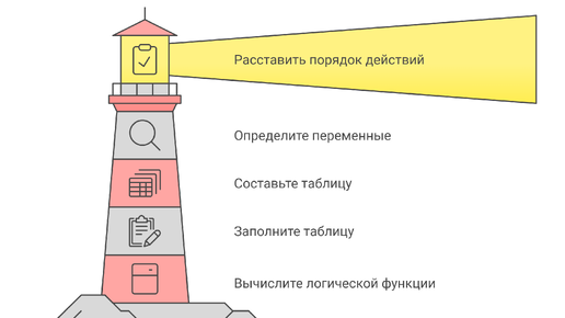1. Расставьте порядок действий: 2. Определите количество переменных: 3. Составьте таблицу: 4. Заполните таблицу: 5. Вычислите значения логической функции: Шаг 1. Шаг 2. Переменные: A и B, значит будет 4 пары входных параметров...