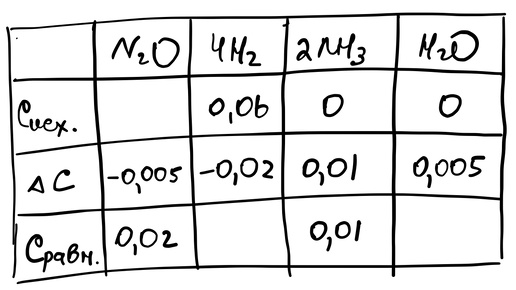 Разберем решение задачи на примере задания из демоверсии 2025. Первое что необходимо сделать - это нарисовать таблицу, чтобы облегчить решение задачи. Количество строк всегда будет равно 4, количество столбцов будет равно количеству веществ в уравнении. Я записываю вещества с коэффициентами, чтобы в дальнейшем было удобнее считать ΔC. Левый столбец у нас отведен для величин: C(исх) - исходная концетрация (моль/л); ΔC - изменение концентрации (моль/л); С(равн) - равновесная концентрация (моль/л)...