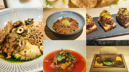 11 (?) Эффектных подач блюд с необычными вкусами (на самом деле я сбилась со счета) На фото гаспачо с копчёной паприкой и грибы вешенки со вкусом мяса - вкусно! Ресторан рекомендуется бронировать примерно за месяц, особенно на сет-меню. Летом можно довольно свободно попасть на веранду, но количество столов там ограничено числом 5. Вас встречают и провожают на кухню, где можно наблюдать за работой поваров. Готовят для вас здесь и сейчас. Первая подача - комплимент от ресторана. В шариках розовая вода, в бокале лайм и алое...