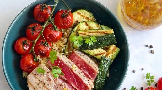 В идеале овощи и тунца в этом рецепте готовить на углях на решетке, но если вы не собираетесь на природу, то вам отлично подойдёт и сковорода-гриль. Полезный и полноценный ужин, который понравится всей семье. #пп Ингредиенты: тунца (предварительно размороженных), мелких цукини, помидоров черри на ветке, булгура, чеснока, корня свежего имбиря, сок и цедра 1/3 лимона, оливкового масла, соль, свежемолотый чёрный перец Способ приготовления: Очистите чеснок и имбирь, мелко порубите, смешайте с оливковым маслом и цедрой, разделите эту смесь пополам...