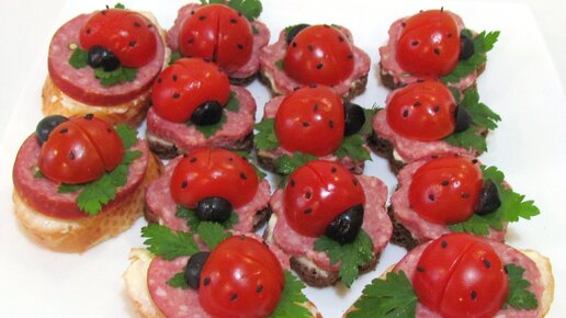 Бутерброды и сэндвичи – идеальная закуска для детской вечеринки. Их любят все дети, они просто готовятся и их можно есть прямо руками. Однако, чтобы привлечь детское внимание, бутерброды должны быть не просто вкусными, но и яркими, интересно собранными. В виде божьей коровки. Один из таких рецептов – бутерброды на детский день рождения, которые выглядят, как божьи коровки. Для их сборки возьмите: 1 белый мягкий батон; 100 граммов качественного сливочного масла; 200 граммов черри помидоров; 8 черных маслин; 6 листиков салата; 100 граммов твердого сыра; несколько веточек укропа...
