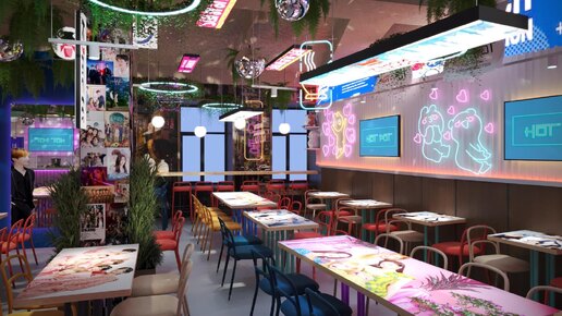 Кафе Hot Pot — это не просто место, где подают корейскую еду. Это пространство, где гастрономия соединяется с поп-культурой. Интерьер вдохновлён Сеулом — городом, где традиции и хай-тек, уличная еда и свет неоновых вывесок живут в одном ритме. Здесь современный минимализм встречается с яркими элементами K-pop эстетики. Неон, лайтбоксы, постеры с айдолами, экраны с клипами и фото-зоны делают зал живым и эмоциональным. Каждая деталь работает на создание атмосферы корейского мегаполиса — энергичного, динамичного и немного театрального...