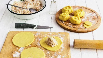 Для приготовления курника можно использовать сдобное, пресное, слоенное или песочное тесто. По правилам традиционного пирога использует два вида теста. Одним видом разделяют слои пирога, а второй используют для изготовления шапки пирога. Курник, приготовленный по всем правилам – это пирог с несколькими разными начинками. Бездрожжевое тесто для курника Ингредиенты: