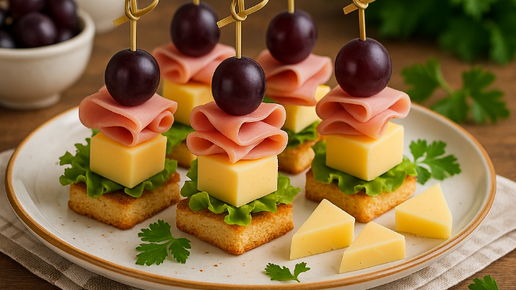 Канапе с ветчиной, сыром и виноградом — нежная закуска для праздничного стола и не только