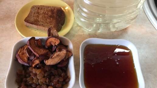 Ингредиенты: Способ приготовления: Я делала квас в пятилитровой бутылке. Для этого наливаем в неё сок по плечики. Хлеб поджариваем в тостере или на сковороде до румяности, ломаем его на кусочки. В отдельной посуде соединяем мёд с небольшим количеством сока, выкладываем туда кусочки хлеба, перемешиваем. Лучше подождать когда мёд полностью растворится. Полученную смесь перекладываем в бутылку с соком. Добавляем изюм и яблоки. Закрываем крышкой, плотно не завинчиваем...