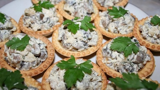Вкусная и быстрая закуска на праздничный стол. Тарталетки с начинкой из курицы и грибов.