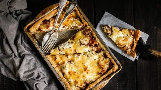 Для приготовления "Открытого кетопирога с лисичками" используются свежие или замороженные грибы, которые обжариваются на сковороде с луком и специями, чтобы придать им более насыщенный вкус. После этого грибы выкладываются на подготовленное тесто и запекаются в духовке до золотистой корочки.