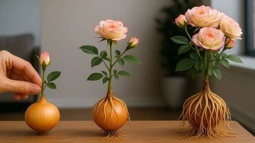 Воткнула розу из букета в лук — через 10 дней чуть не упала: черенок оброс корнями как бородой