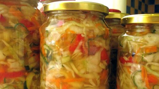Я обожаю этот салат еще с детства. Его готовила моя бабушка. Очень вкусный овощной салатик на зиму! А готовить на удивление просто. Практически все ингредиенты имеются на каждом огороде. Нам понадобится: Количество соли и сахара можно корректировать, подгоняя под свой вкус. Способ приготовления: Все овощи нарезать как на салат - капусту нашинковать, огурцы - полукружками, перец болгарский - соломкой, помидоры - произвольно, но не крупно и не мелко. Морковь перетереть на крупной тёрке. Подготовленные овощи сложить в глубокую кастрюлю...