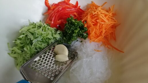 Ингредиенты: Фунчоза - это вермишель стеклянная. У меня сегодня такая. Способ приготовления стеклянной лапши можно сделать, так как указано на упаковке. Я например беру из пачки 2 скрученных вермишели - это и есть половина упаковке. Кладу в кипящую воду и готовлю до готовности, до степени необходимой мне мягкости это около 5-6 минут и затем откидываю на дуршлаг, тем самым даю ей стечь и остыть. Готовую фунчозу выкладываю на разделочную доску и рублю её помельче,...