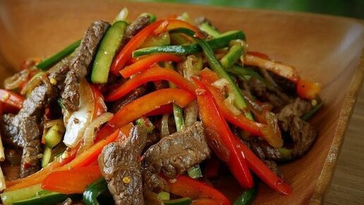 Салат из жареной говядины, огурцов и болгарского перца. Обязательно попробуйте.