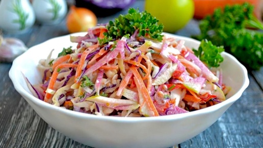 Великолепный овощной салат. Несколько удачных вариантов его приготовления. Сочно, хрустяще, вкусно и полезно. Знакомый всем и любимый многими салат «Коулслоу» занял почетную нишу в меню российских граждан. Впервые салат был представлен в популярной фастфудной сети. Там он подавался в симпатичных бумажных стаканчиках и был щедро залит нежным майонезно-молочным соусом, обладающим едва уловимым ароматом ванили. Беспроигрышное комбо из сочной капусты и хрустящих кусочков курицы увеличивало количество адептов салата в геометрической прогрессии...