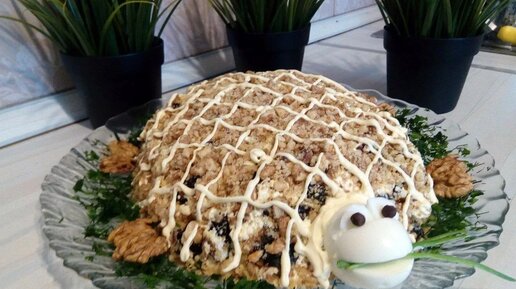 Лёгкий и вкусный салат «Черепаха» из курицы, яблок, грецких орехов