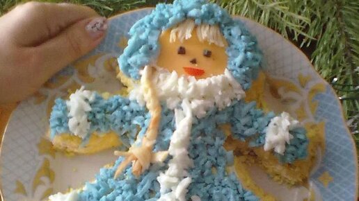 Салат слоеный, поэтому выкладываем на плоское блюдо слои по очереди в виде фигурки Снегурочки: