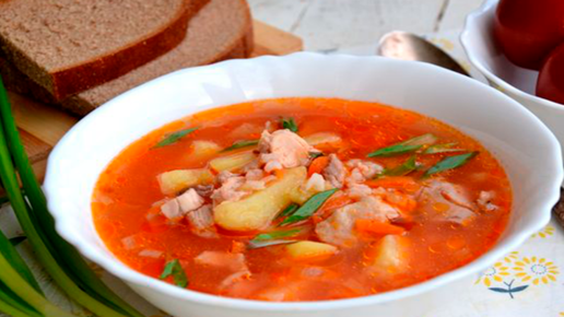 Рассольник с солеными помидорами и копченой грудинкой