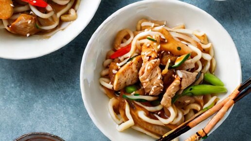 Удон — универсальная азиатская лапша, которая отлично сочетается с мясом, овощами, сыром и пряными соусами. Это блюдо очень популярно в Азии, его легко приготовить дома. Лапшу можно сочетать с мясом, овощами, грибами и даже сыром, создавая разнообразные и вкусные вариации. В нашей подборке — пять проверенных рецептов: с курицей, свининой, тофу, овощами и сыром. Выбирайте свой вариант и наслаждайтесь ароматной и сытной лапшой! Ароматная лапша удон с сочной курочкой и хрустящими овощами готовится быстро, а результат порадует всю семью...