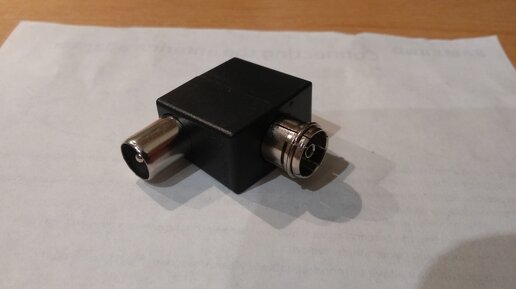Очень интересный адаптер идёт в комплекте с телевизорами известной корейской фирмы. Думал сначала, что это просто угловой переходник, для удобства подключения антенны в труднодоступных местах. Оказывается адаптер защищает изделие от повреждения или возгорания. Подключается он не к телевизору, а к розетке антенны на стене и снимает перегрузку с кабеля. Разобрав адаптер, можно увидеть микросхему в металлическом экране. Вскрываем корпус и видим три резистора. Примечание в инструкции: может ухудшить сигнал от антенны...