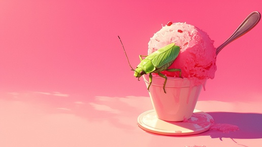 Создано на основе запроса: A scoop of pink strawberry ice cream with a realistic green Pentatomoidea insect (shield bug) crawling on top, centered on a retro diner-style table, clean minimal pink background, cinematic lighting, high contrast, vintage color grading, quirky and stylish composition, inspired by Quentin Tarantino movies --- Автоперевод: Шуф розового...