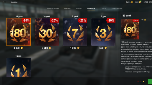 Наверняка вы наслышаны о Премиум Аккаунте в игре World Of Tanks Blitz. Он всегда продаётся только в клиенте игры. И тут мы переходим к первому способу: Покупка самого большого пакета Премиум аккаунта Именно столько дней Премиум Аккаунта будет выгодней взять, чем другой какой-либо пакет. Допустим, что мы хотим купить аккаунт на 180, но добьем пакетами по 30 дней. Итак 180/30 = 6 (Это то, сколько мы возьмем пакетов) И 6*2000 = 12000 золота (Сколько мы заплатим за раздельную покупку пакетов) Получается, мы экономим целых 4000 золота...