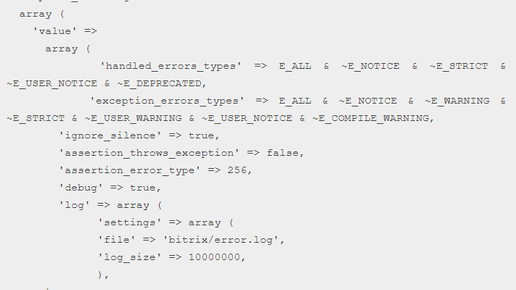 При разработке под Битрикс можно пользоваться не только логами, установленными в конфигурации сервера, но и своими. Для этого нужно настроить обработчик ошибок в секции exception_handling в файле /bitrix/.settings.php Можно использовать кастумный обработчик ошибок для записи логов. Конфигурируется...