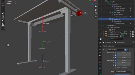 Памятка: как настроить кости для телескопической механики в Blender 📚 Решил зафиксировать настройку рига для регулируемого стола, пока свежо в памяти. В следующий раз, когда понадобится сделать похожую механику (телескопические стойки, выдвижные элементы и т.д.) — не придётся заново гуглить и вспоминать 😅 Может и вам пригодится! 🏗 Иерархия костей: Armature.001 └── Base_Bone [ROOT - основание] ├── Middle_Bone [Child of Base_Bone] │ └── Top_Bone [Child of Middle_Bone] │ └── Control_Bone [Child of Base_Bone] 📋 ЧАСТЬ 1: Настройка костей 1...