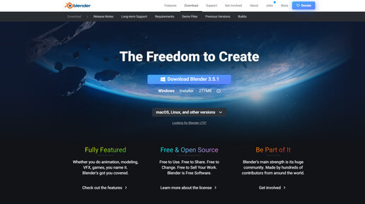 Первым шагом для установки программы является посещение официального сайта Blender - https://www.blender.org/download/. На главной странице вы сможете найти заголовок с кнопкой для загрузки "Download Blender 3+".