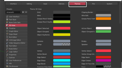 Еще один прием, который помогает сделать работу в 3D редакторе Blender максимально комфортной. Это возможность изменения визуального оформления. Попасть туда можно по обычному пути File — User Preferences и там найти вкладку Themes Количество элементов которые можно изменить — просто огромное...