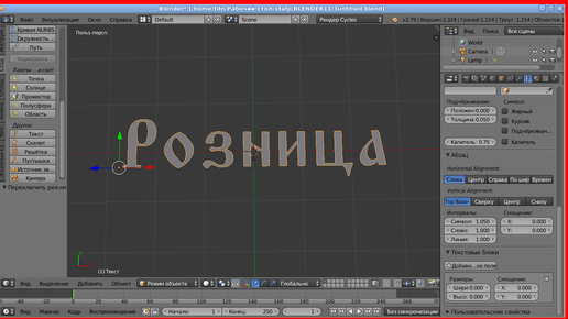 Сегодня попробуем создать трёхмерный текст не путём экструдирования, а с помощью модификаторов. Движок — Рендер Cycles. Добавляем и правим текст (Tab), подгоняем нужный размер и межсимвольный интервал (1.050). В этот раз возьмём славянский шрифт TriodPostnaja работы Даниэля Джонсона. Поместим его заранее в папку с проектом. Лицензия шрифта свободная — OFL. Да уж, вот до чего дошло — иностранец создаёт свободный славянский шрифт — и очень неплохого качества… Сразу трансформируем текст в полисетку (Alt+C)...