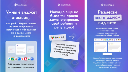 Размещайте лучшие отзывы о ваших услугах и товарах на своем сайте из популярных геосервисов, маркетплейсав и отзовиков. Виджет отзывов SmartWidgets – идеальное решение! Наше решение подходит для всех, кто продвигает бизнес в интернете: ✅ Digital-маркетологи