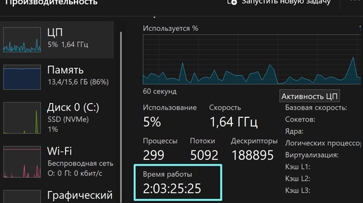 Сколько Windows работает без перезагрузки Иногда компьютер начинает работать «как-то не так»: чуть дольше открываются программы, появляются мелкие подвисания, что-то запускается со второй попытки. И причина может быть очень простой — система давно не перезагружалась. 1. Нажмите Ctrl + Shift + Esc — откроется Диспетчер задач. 2. Перейдите во вкладку Производительность. 3. Выберите ЦП (процессор). 4. Внизу найдите строку «Время работы». Там указано, сколько дней, часов и минут Windows работает без перезапуска...