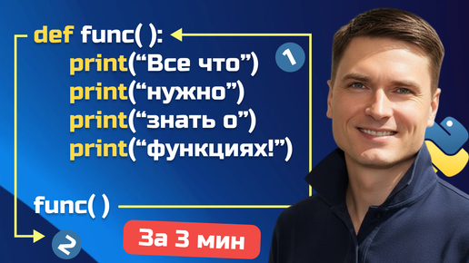 Функция в Python — это именованный блок кода, который можно вызывать многократно из разных частей программы. Представьте, что вы пишете программу для расчёта площади фигур. Без функций вам пришлось бы копировать код для каждой фигуры заново. С функциями же вы создаёте "инструмент" один раз и используете его когда угодно. Преимущества функций: В Python функции определяются с помощью ключевого слова def. Давайте разберём синтаксис. Синтаксис определения функции выглядит так: Пошаговый разбор: Вот простейший...