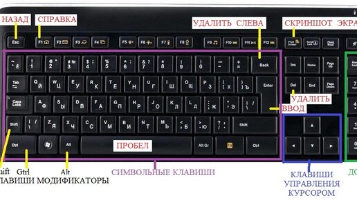 В этой статье мы ознакомимся с компьютерной клавиатурой, рассмотрим назначение наиболее часто используемых клавиш. Клавиатура – это устройство для ввода данных в компьютер: букв, цифр и знаков. Также используется для управления системой, то есть является аналогом компьютерной мыши. По типу соединения клавиатура бывает проводной и беспроводной. Обычную клавиатуру можно условно разделить на несколько областей, что и показано на следующем рисунке. Давайте рассмотрим все эти области и выделим те клавиши, которые нам понадобятся при ежедневной работе на компьютере...