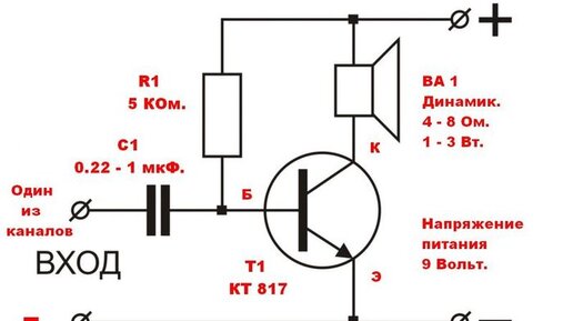 Это достаточно простой усилитель работающий от 9В. Компоненты Сборка В качестве разьема для сигнала можно использовать распространенный разьем мини джек: Принцип работы Сигнал приоткрывает транзистор в зависимости от уровня сигнала...