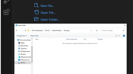 Для начала нам нужно создать папку для нашего будущего проекта. Я обычно храню все свои проекты в папке C:\PythonProject. Перейдите в эту директорию и создайте новую папку с названием first_app. После этого можно запустить Visual Studio Code и открыть в нём нашу папку. Для этого нажмите на кнопку “Open Folder…”, затем в открывшемся окне выберите нужную папку и нажмите кнопку “Выбор папки”. В открывшемся окне необходимо подтвердить, что мы доверяем этой папке и всем файлам в ней. Для этого установите...